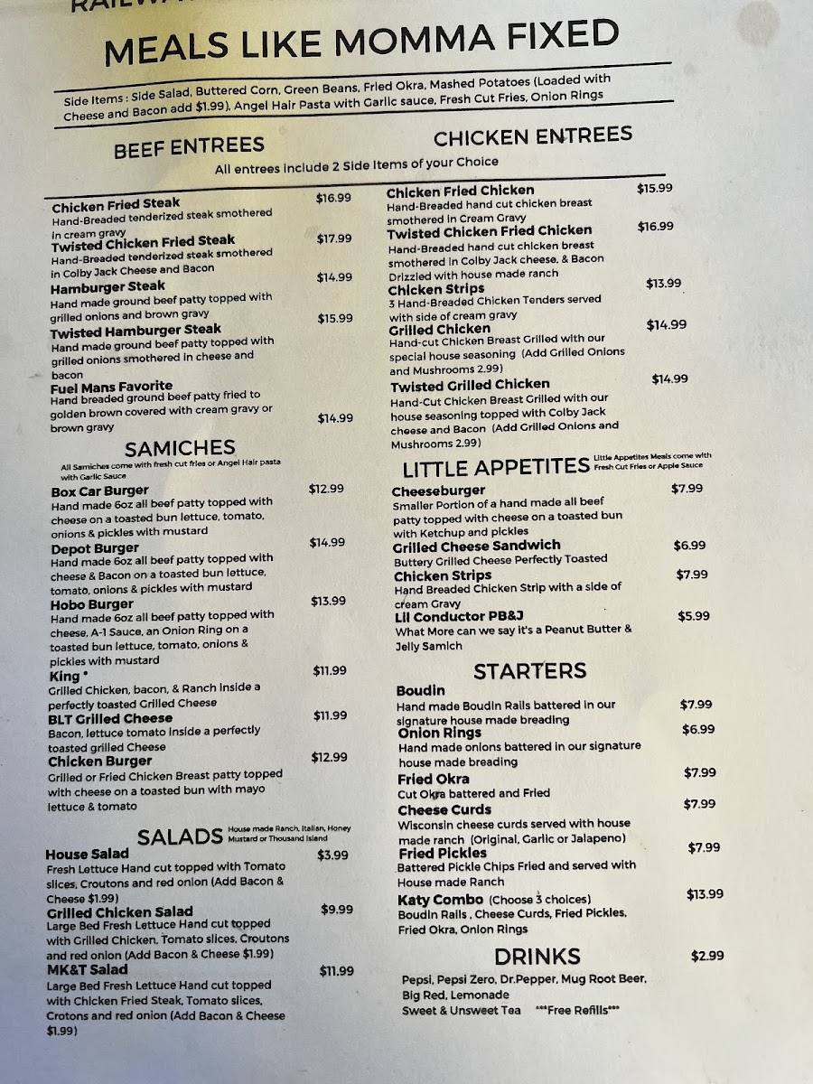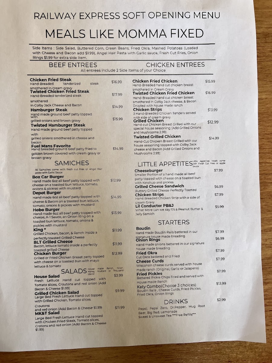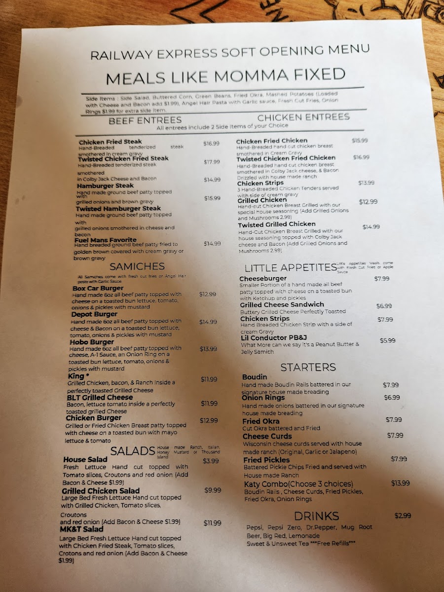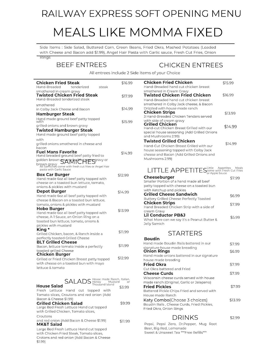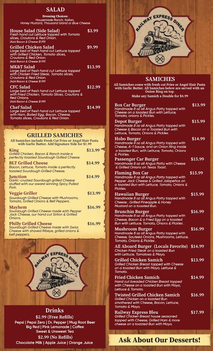 Overall, Railway Express Diner offers a diverse and comforting menu that is sure to satisfy anyone looking for a flavorful meal in a relaxed, welcoming atmosphere. Whether you're in the mood for a hearty burger, a fried chicken dish, or a light salad, this diner has something for everyone.