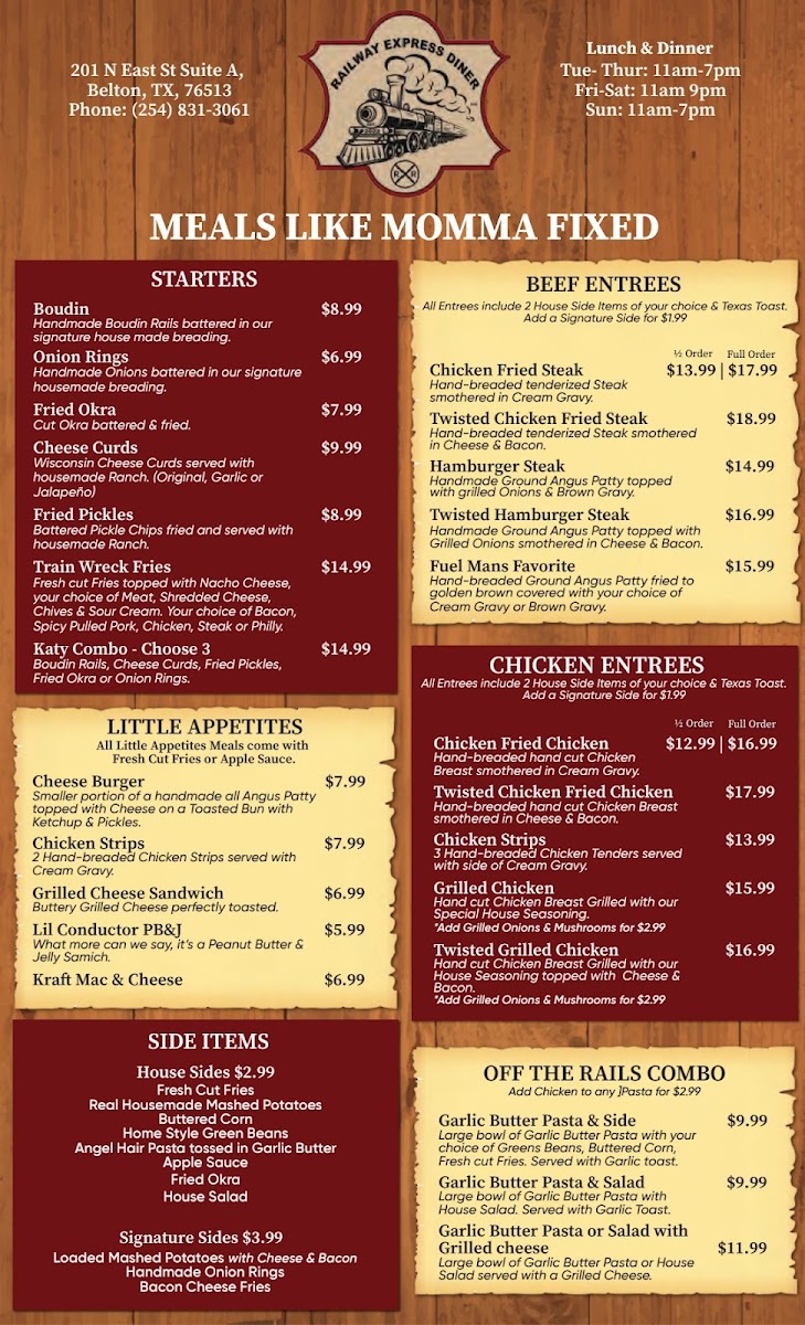 At Railway Express Diner, located at 201 N East St, Belton, TX, the menu offers a wide range of delicious options perfect for every taste. Starting with their Off the Rails Combo, you can choose from a combination of Garlic Butter Pasta & Side, Garlic Butter Pasta or Salad with Grilled Cheese, or Garlic Butter Pasta & Salad - all packed with rich, savory flavors.